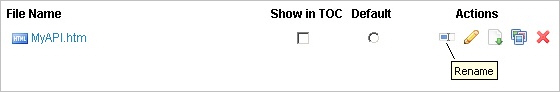 Allows you to configure the name that will display in the Documents section if the Show in Toc option is selected. When selected, a File Name popup displays where you enter the file to be renamed. |