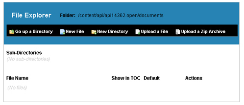 File Explorer is a simple file management tool that allows you to upload documentation source files to various parts of the platform UI: