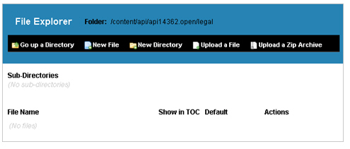 - Here is an example of what the /legal directory looks when you load File Explorer for the first time after creating an API: