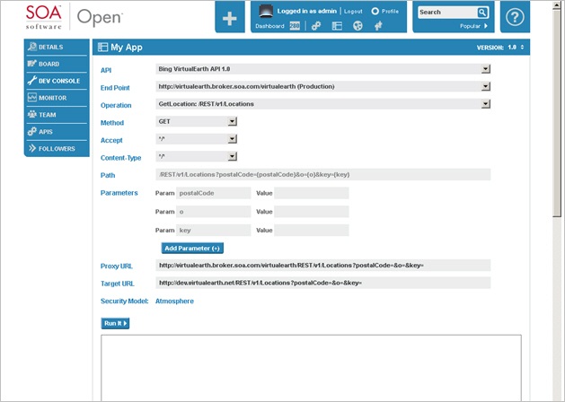 The Dev Console includes an API drop-down that displays a list of the APIs that your app is currently connected to. When you select an API from the drop-down, the platform analyzes the API configuration and the security policies assigned to the API and populates the fields with the appropriate information. After the Dev Console is populated, you configure each test case and click Run It.