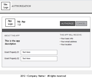 - Additional elements display on the authentication screen that are pulled from the OAuth Provider configuration assigned to the API the app is connected too. These include Site Logo and Grant Properties.