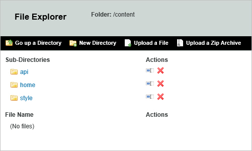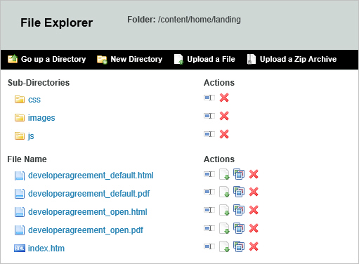 Content that can be uploaded to the platform includes API documentation, Online Help, Landing Page, Signup, and Support. Content will typically consist of HTML files, images that are referenced in the content, any custom styles sheets that support the content, and reference material (i.e., PDF's, diagrams, etc.) that are linked in the content.