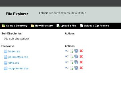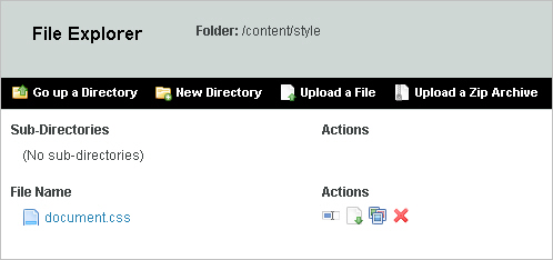 The document.css style sheet contains all the custom styles for both API and Online Help documentation. It is located in the /content/style directory. If you make changes to the document.css file, you can upload it directly to the /content/style directory.
